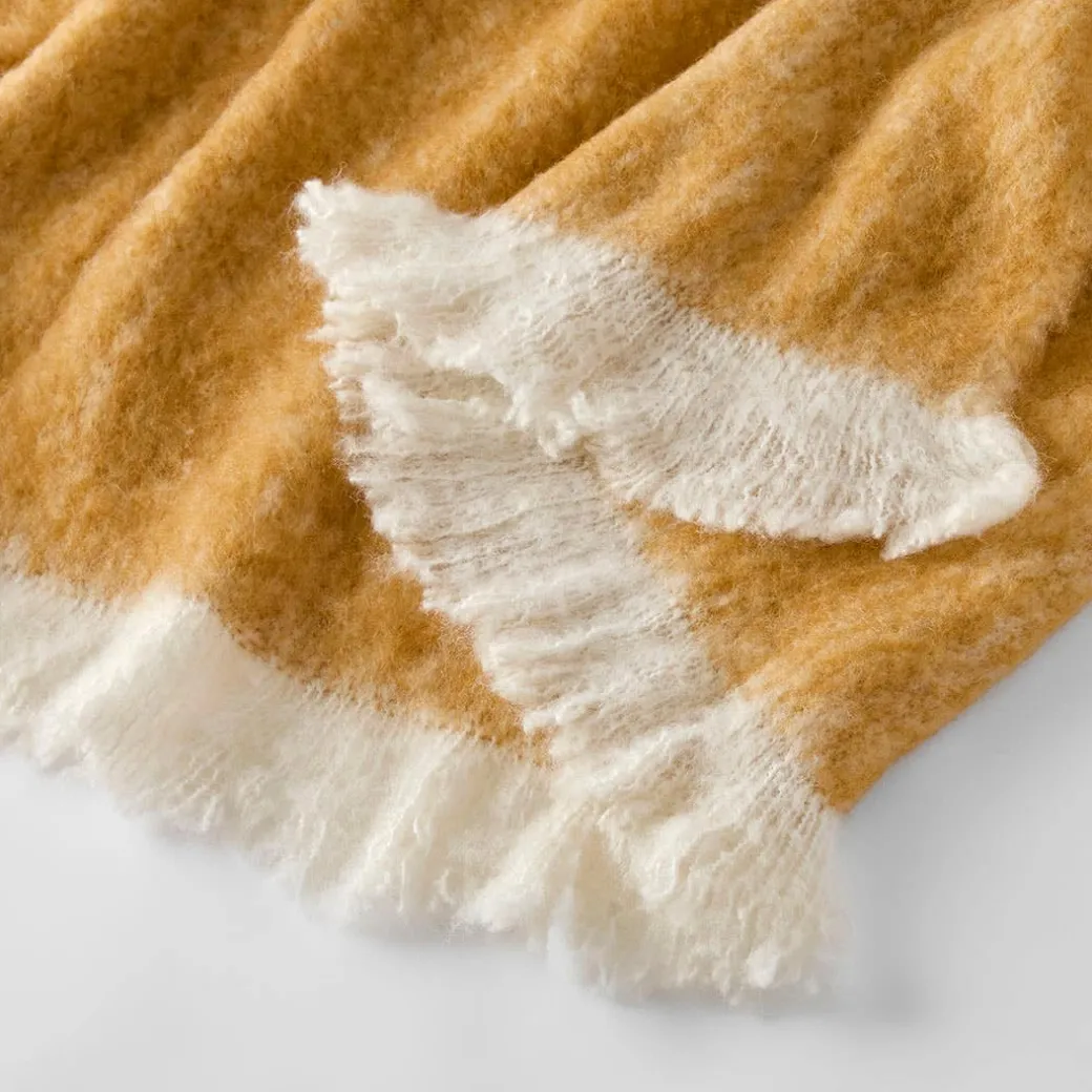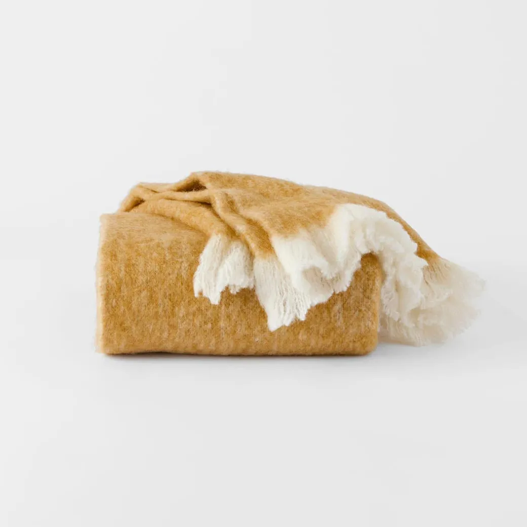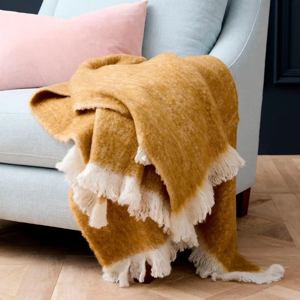 The Ada Throw in moss features a white fringe edge and a brushed, mohair-inspired texture for added softness and warmth. Perfect for styling or getting snuggly.