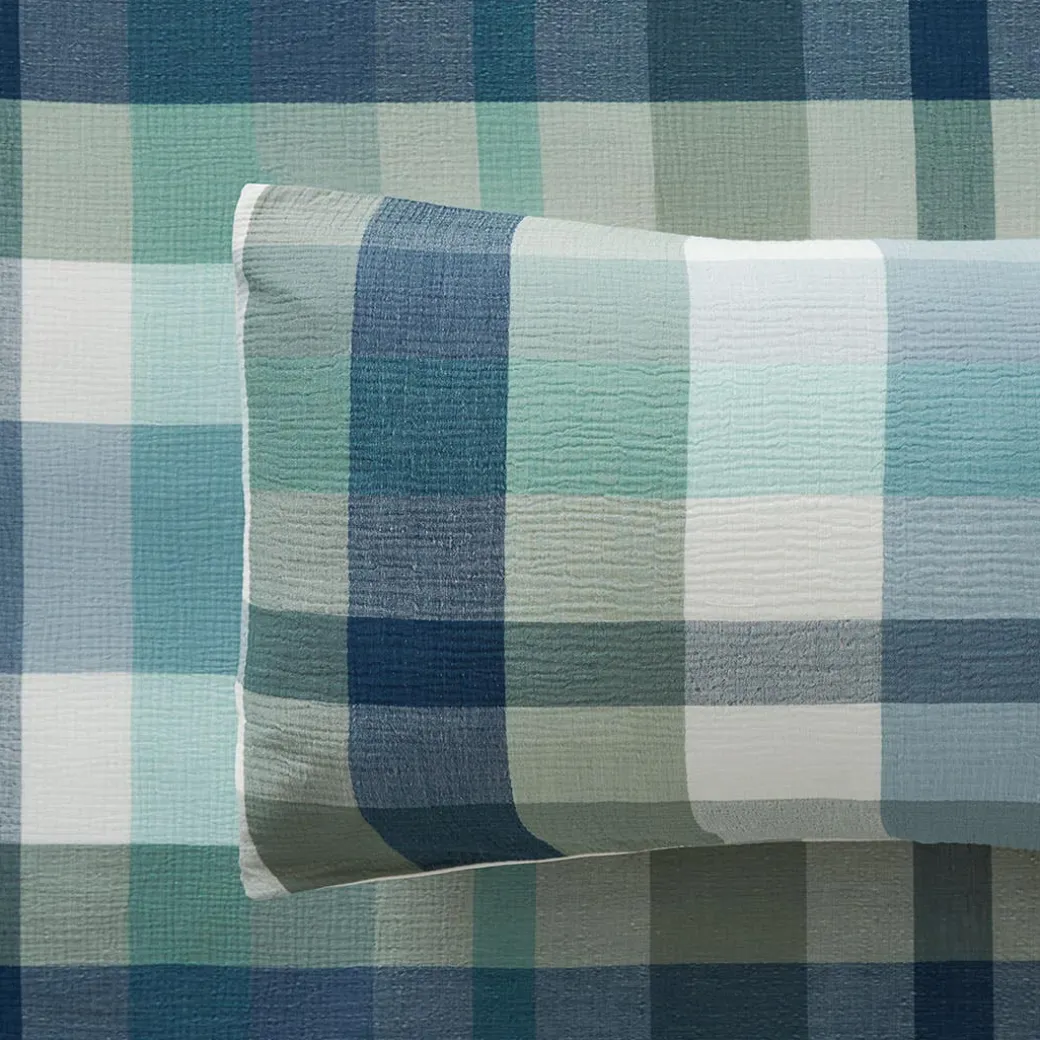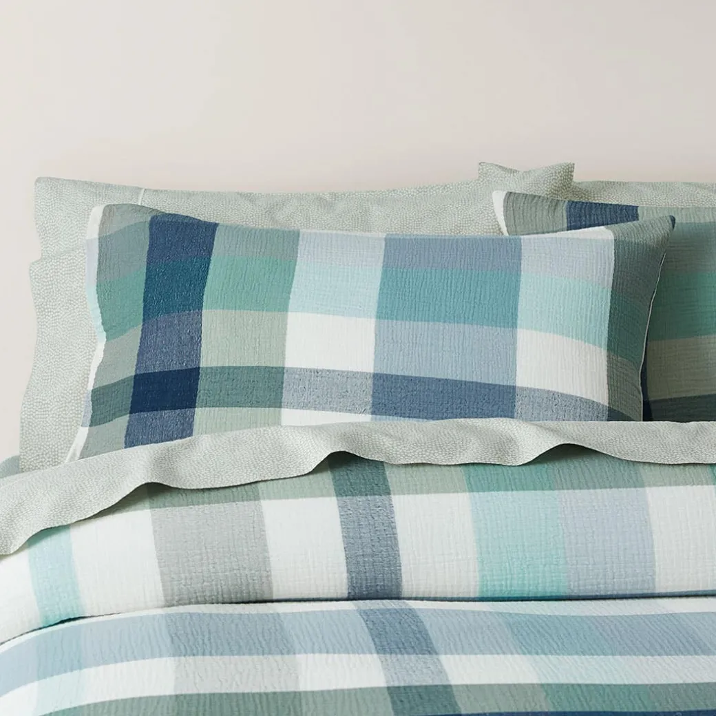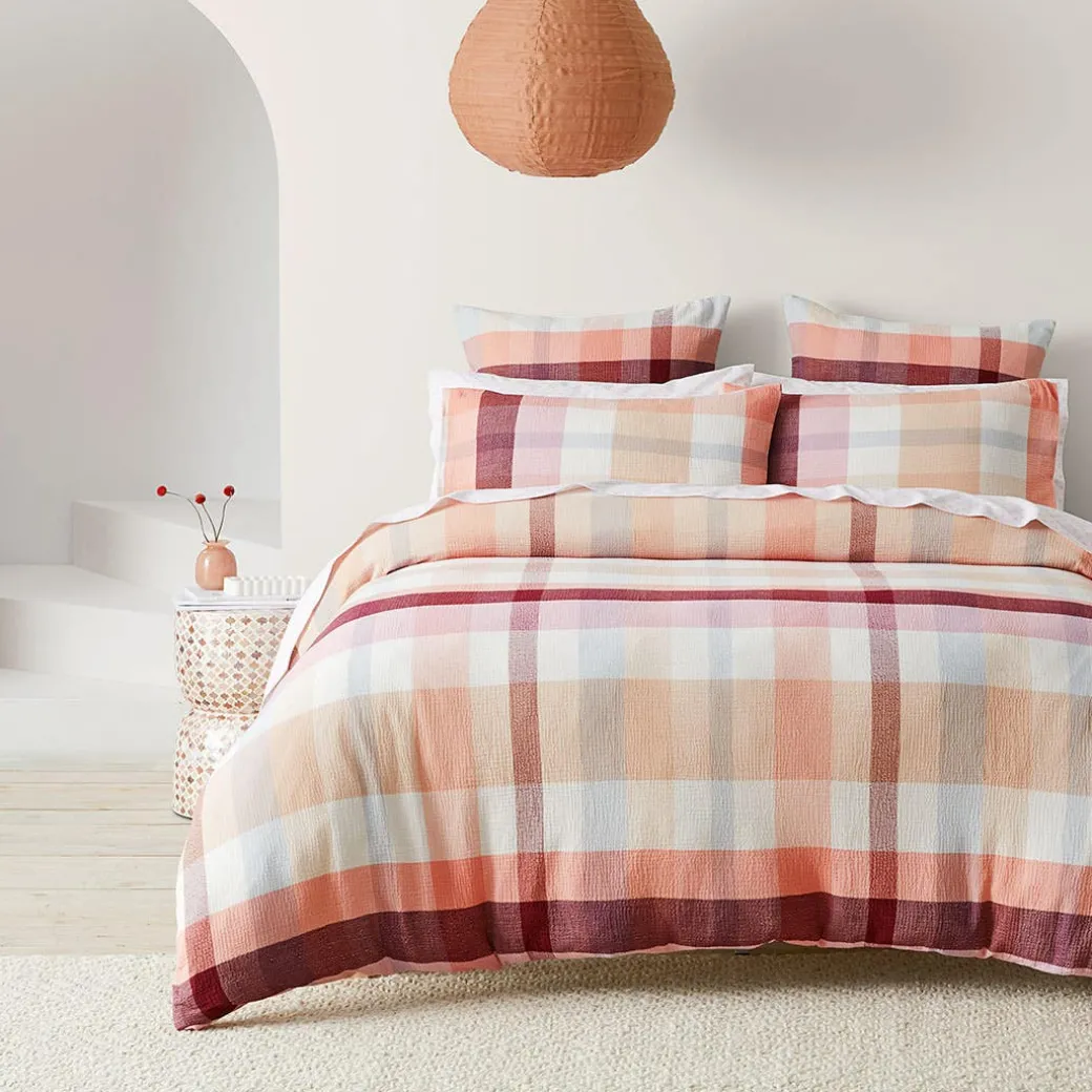 Bring beautiful colour and texture into your bedroom with the Arlo quilt cover in peach and pink. Crafted from cotton muslin with a subtle crinkle texture, this quilt cover features a classic check design in vibrant summer shades. Finished with a plain dye 250 thread count cotton reverse.