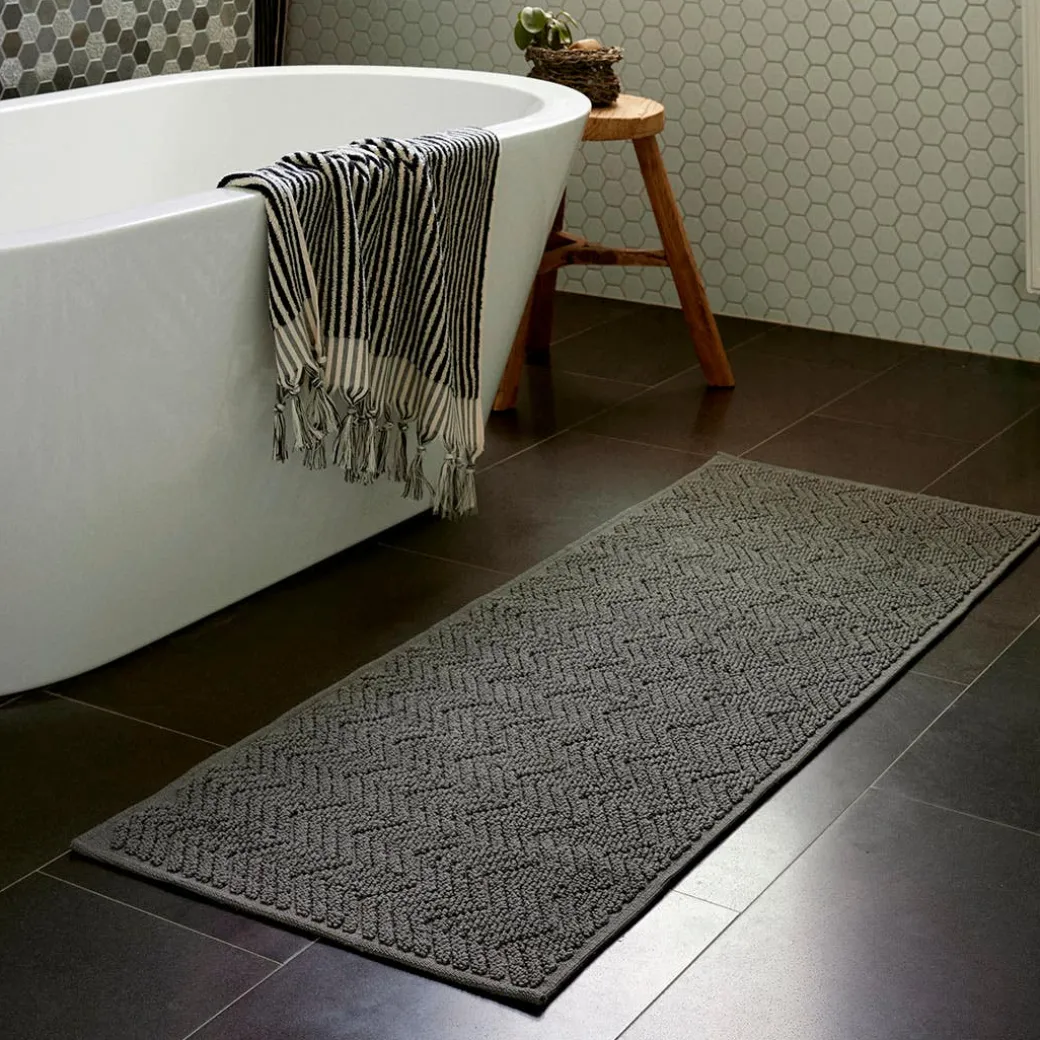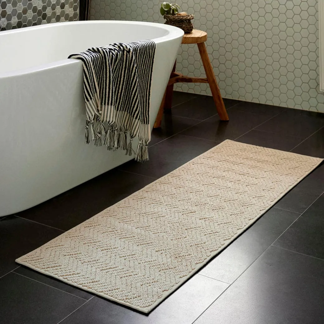 Create a classic bathroom style with the Chevron Bath Runner in Natural. Complete with a non-slip silicone backing, this versatile bath runner features a simple geometric design in a neutral colour palette.
