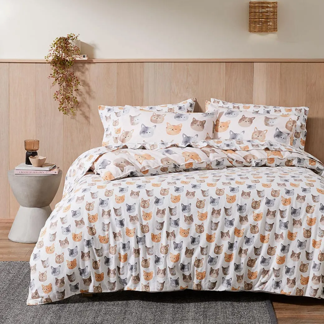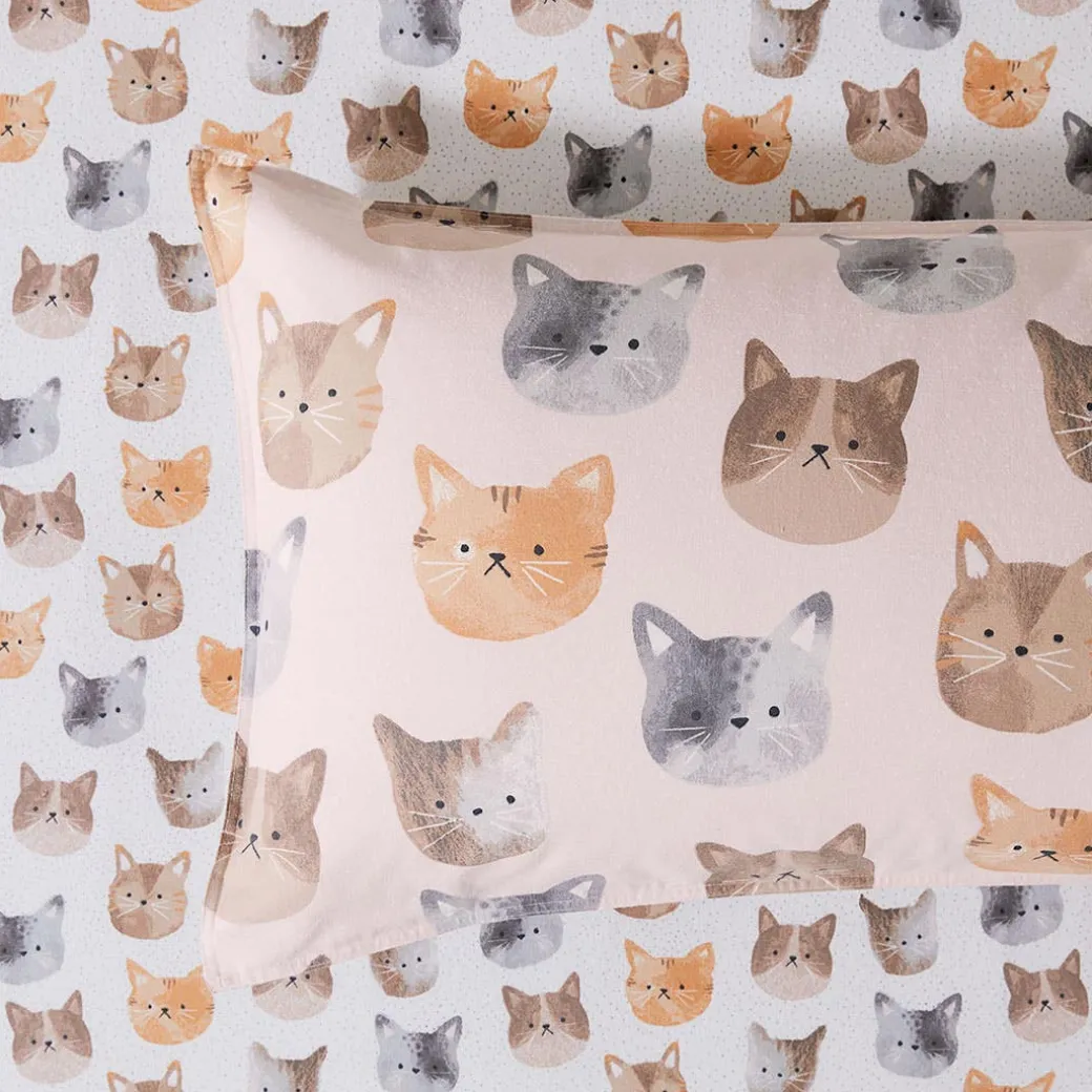 Introduce a playful style with the Nala flannelette quilt cover. Designed in our Melbourne studio, this quilt cover features hand-painted cat faces over a soft blush base. Finished with a twin needle stitch, this design is printed on high-quality cotton flannelette and brushed on both sides for added warmth and softness.