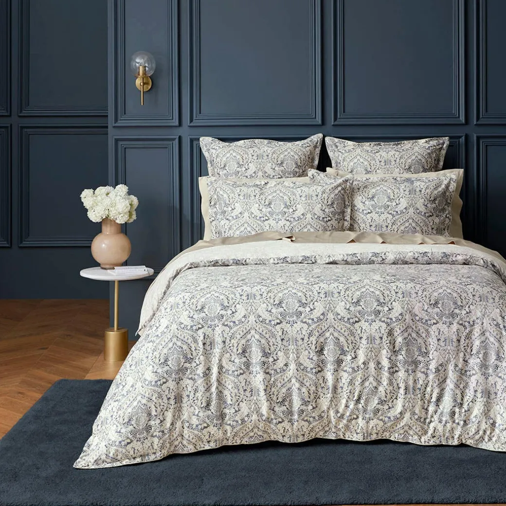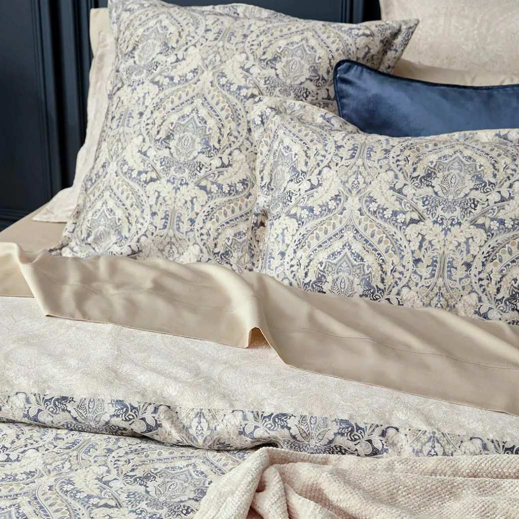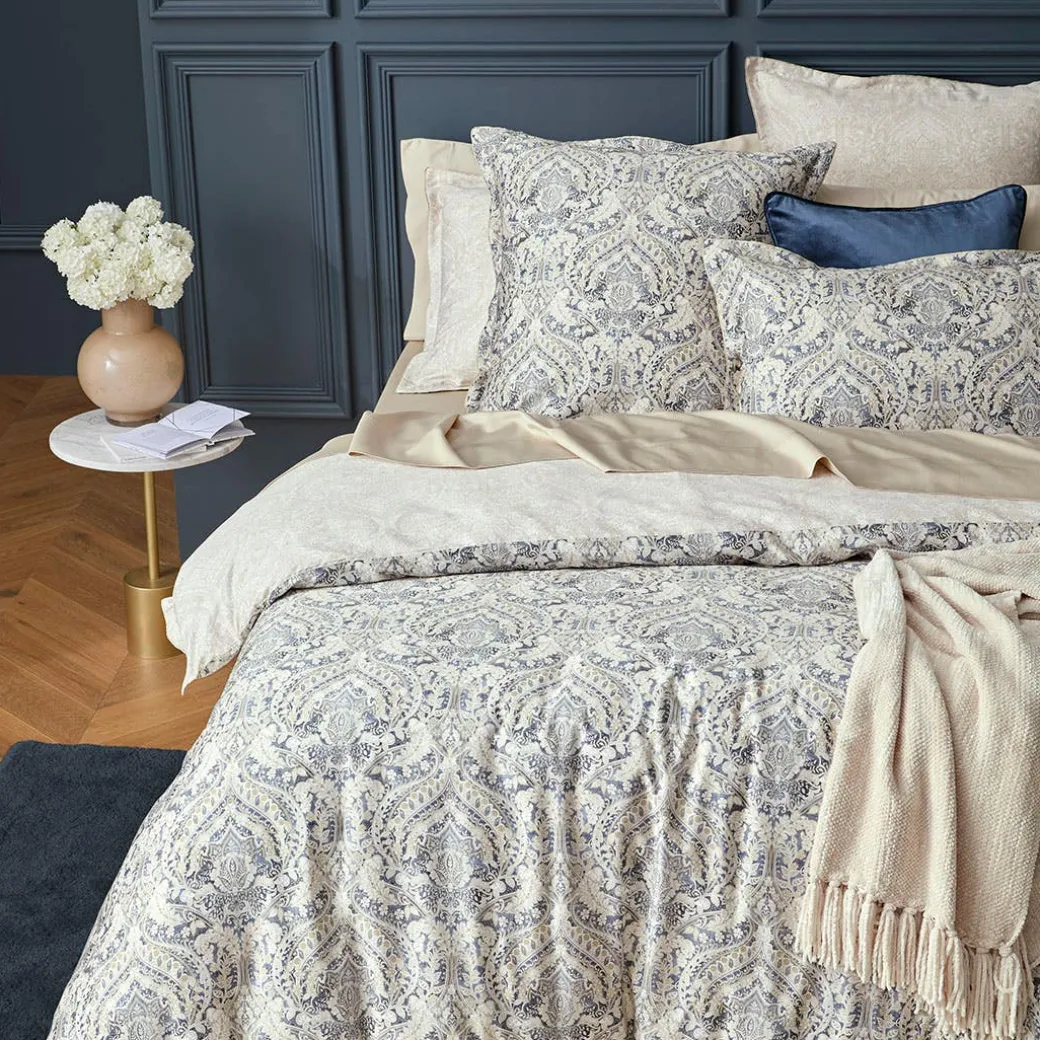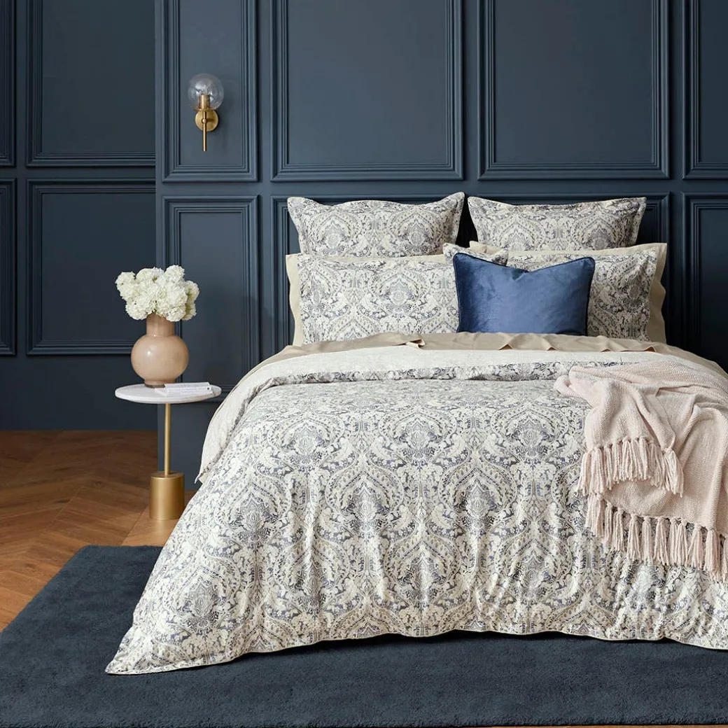 Designed and styled in Australia, contemporary Cotton House designs are perfectly suited to the relaxed Australian way of life. Hand-drawn in our Melbourne studio, the Antonio quilt cover features a paisley damask design in golden hues over an ink blue base. This intricate pattern is printed on cotton sateen, finished with a ribbon trim and pattern reverse. Coordinate with matching European pillowcases to complete the look.