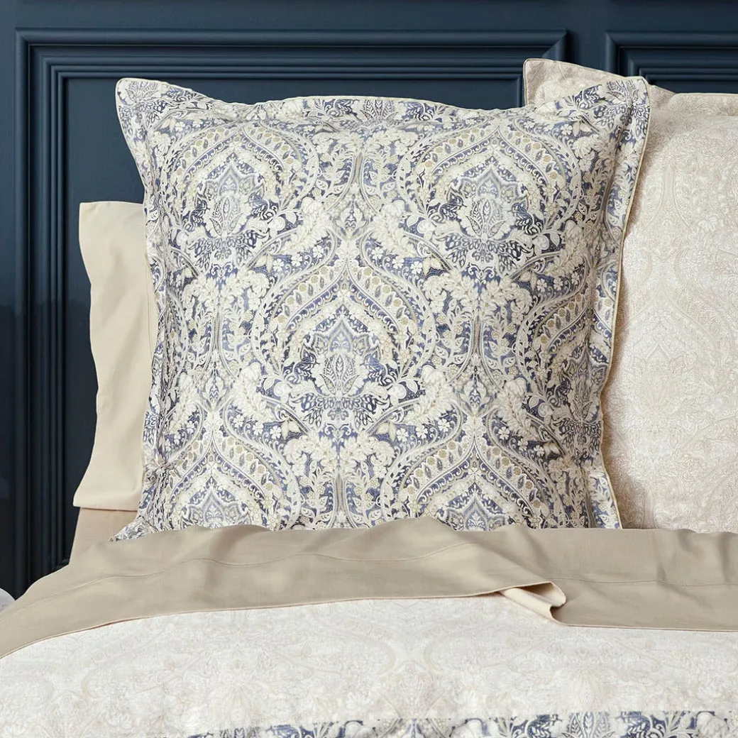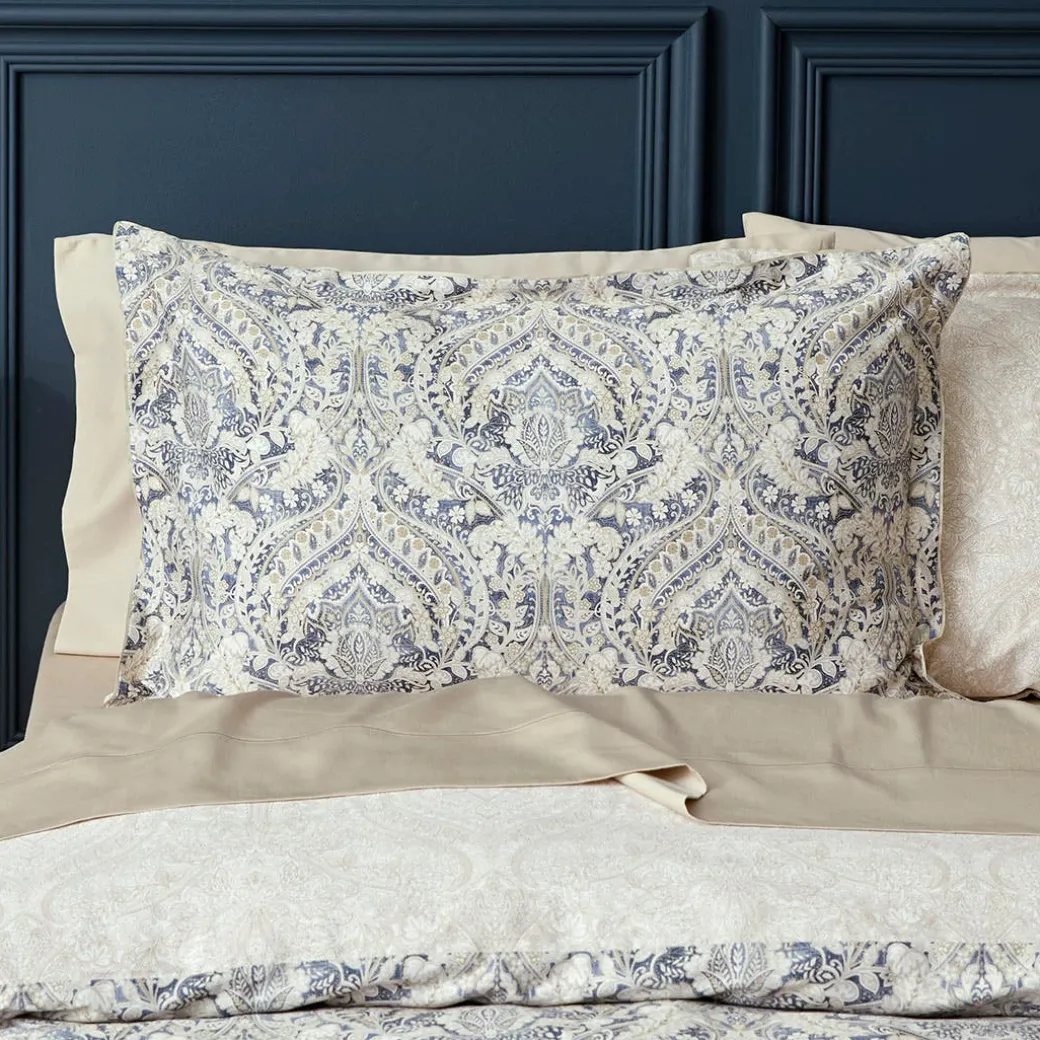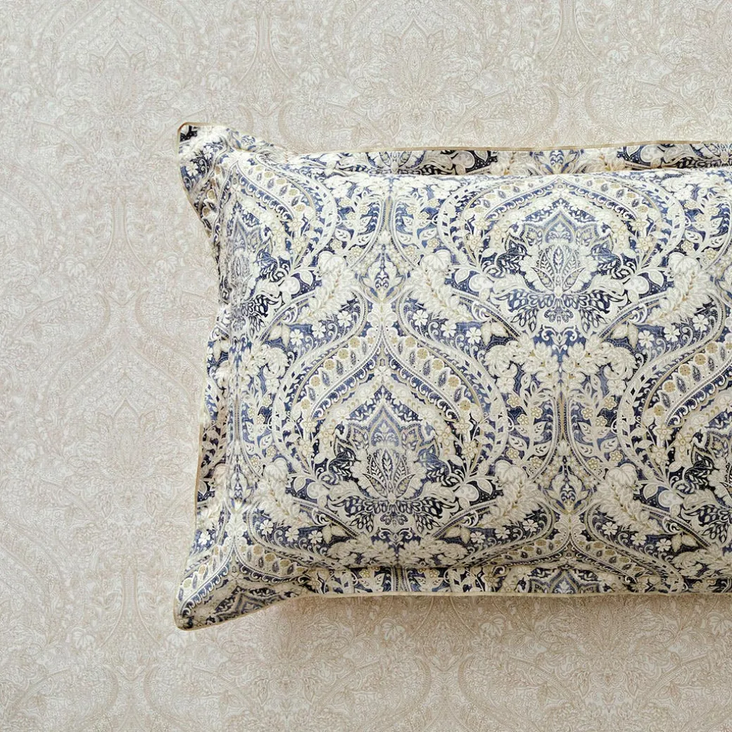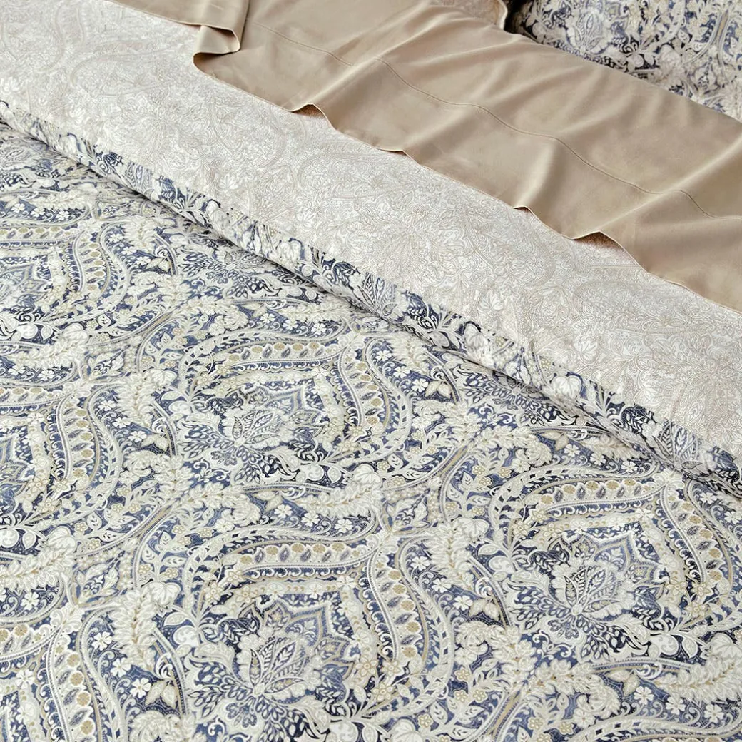 Designed and styled in Australia, contemporary Cotton House designs are perfectly suited to the relaxed Australian way of life. Hand-drawn in our Melbourne studio, the Antonio quilt cover features a paisley damask design in golden hues over an ink blue base. This intricate pattern is printed on cotton sateen, finished with a ribbon trim and pattern reverse. Coordinate with matching European pillowcases to complete the look.