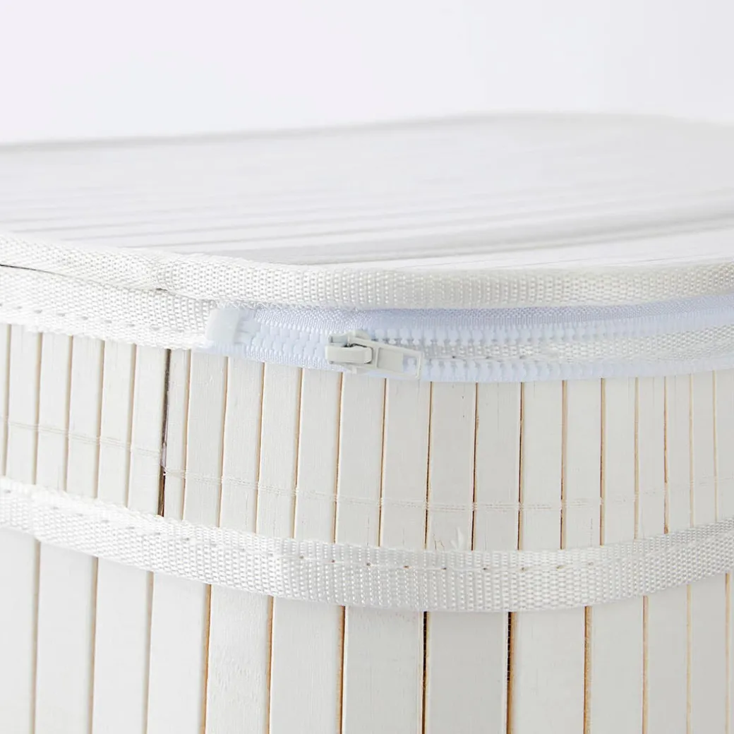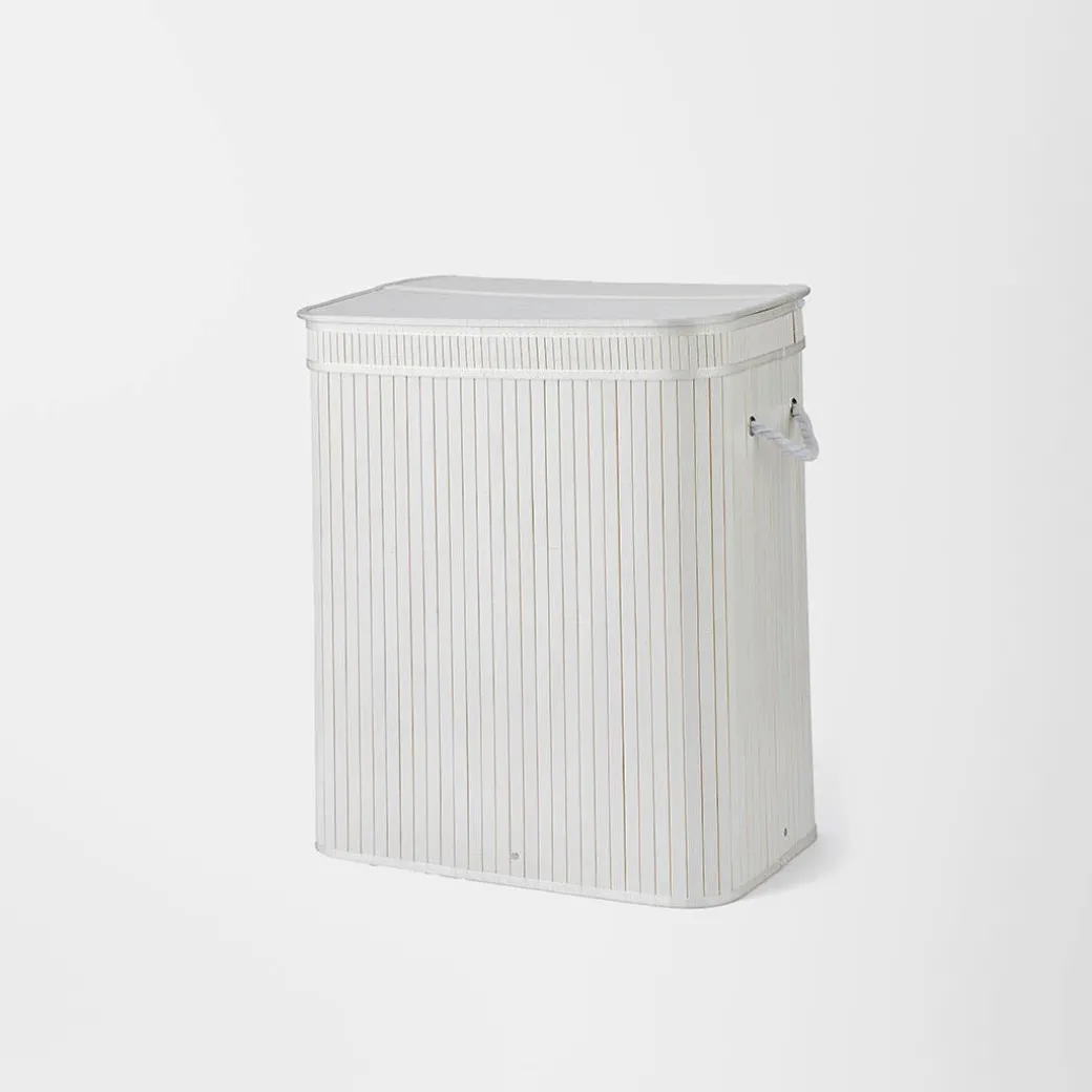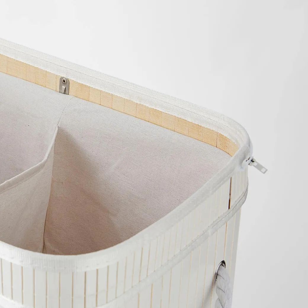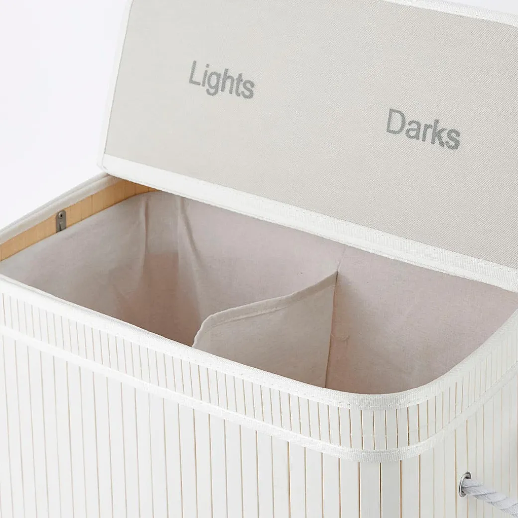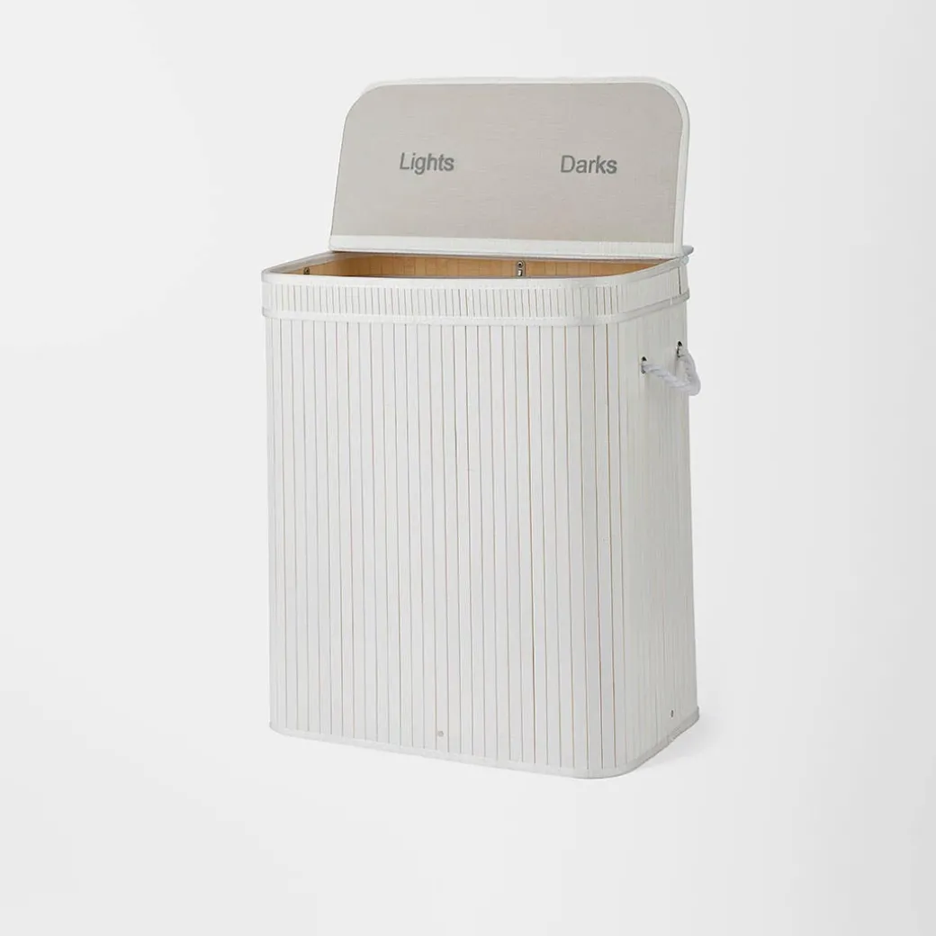 Keep your washing tidy and organised with the Collapsible Bamboo Lights and Darks Hamper in White. Made from bamboo with a steel frame, rope handles and linen liner, this laundry hamper collapses for storage and allows you to easily divide lights and darks.