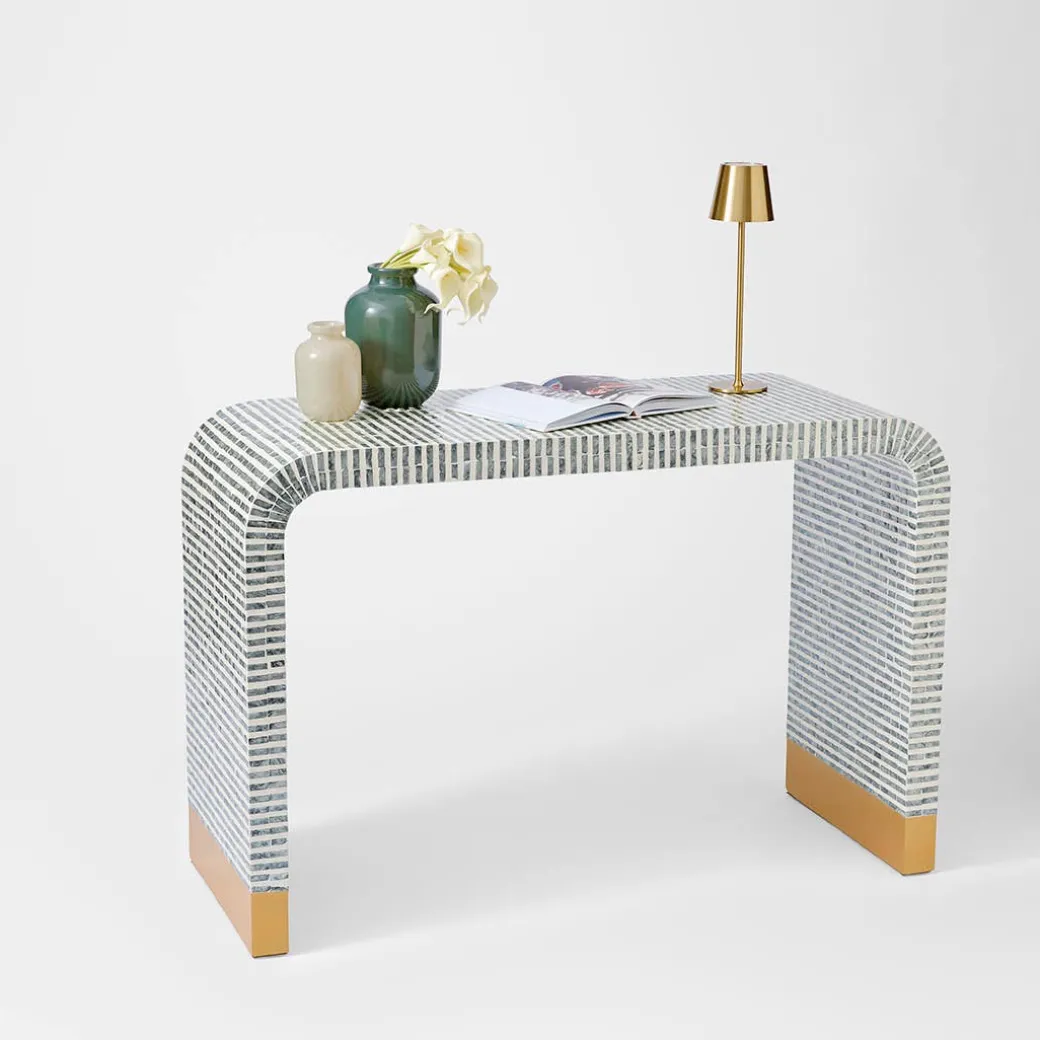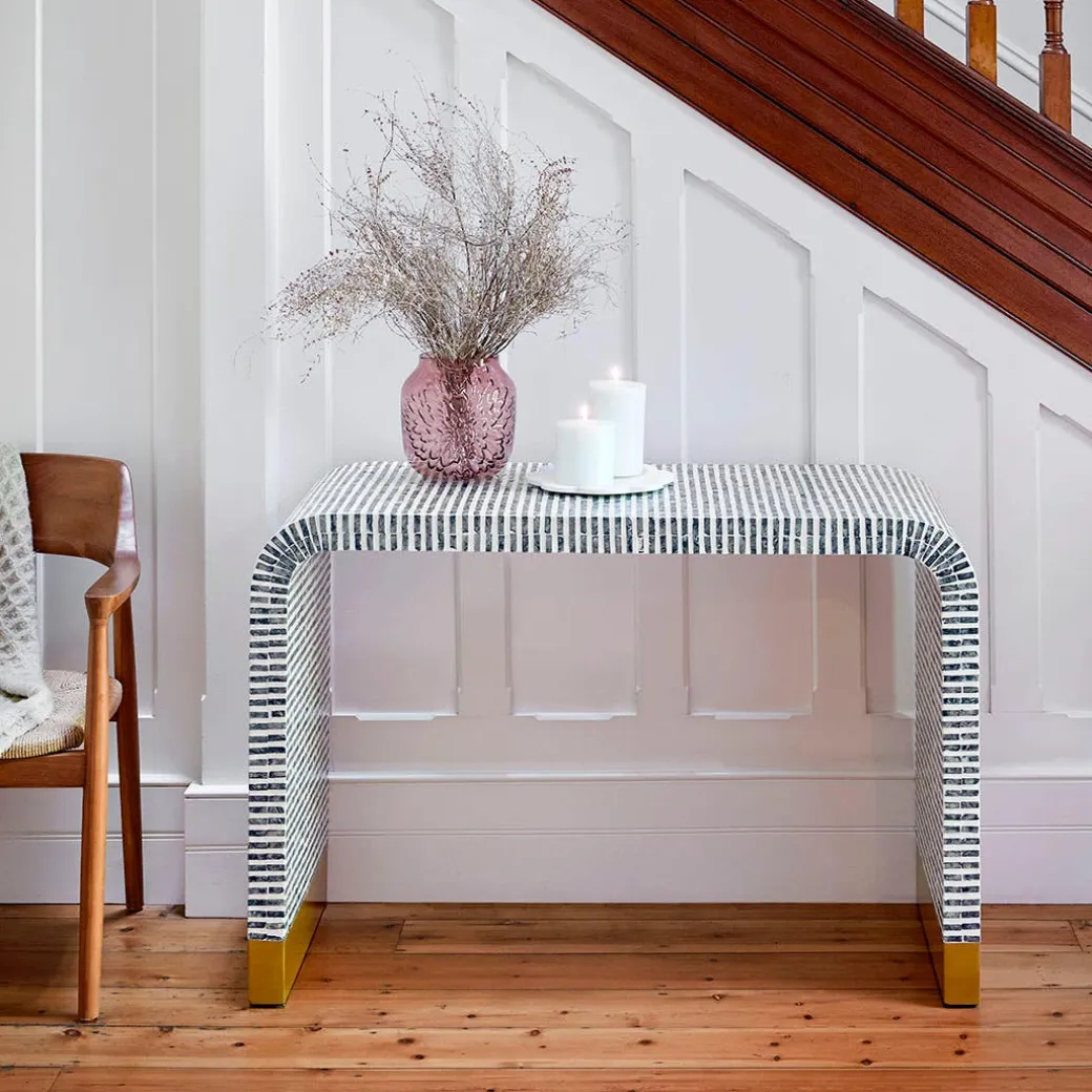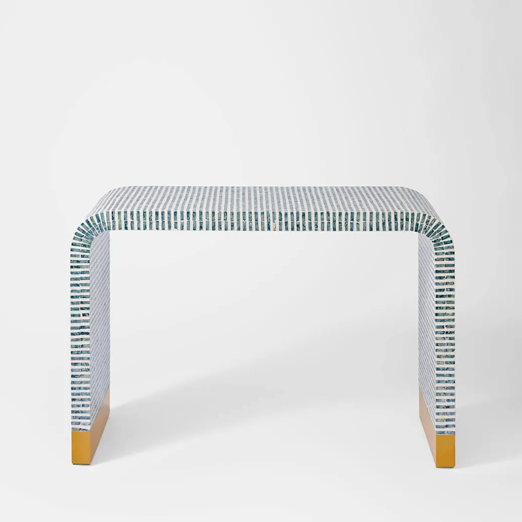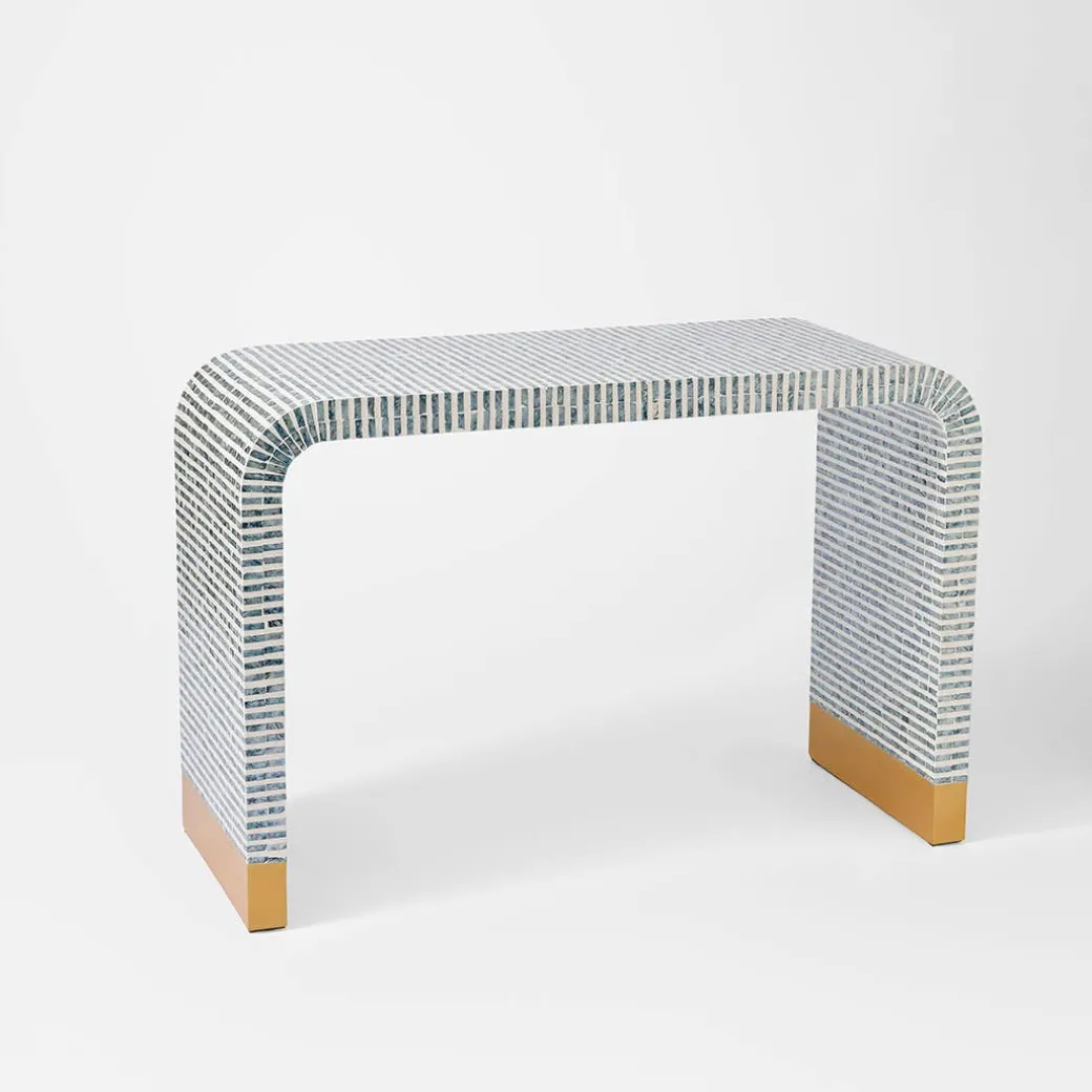 Elevate your space with the Ellery Inlay Console Table in Blue. Featuring an inlay Capiz shell surface, a curved edge and patterned finish make this console table a stunning addition to any hallway or living space.