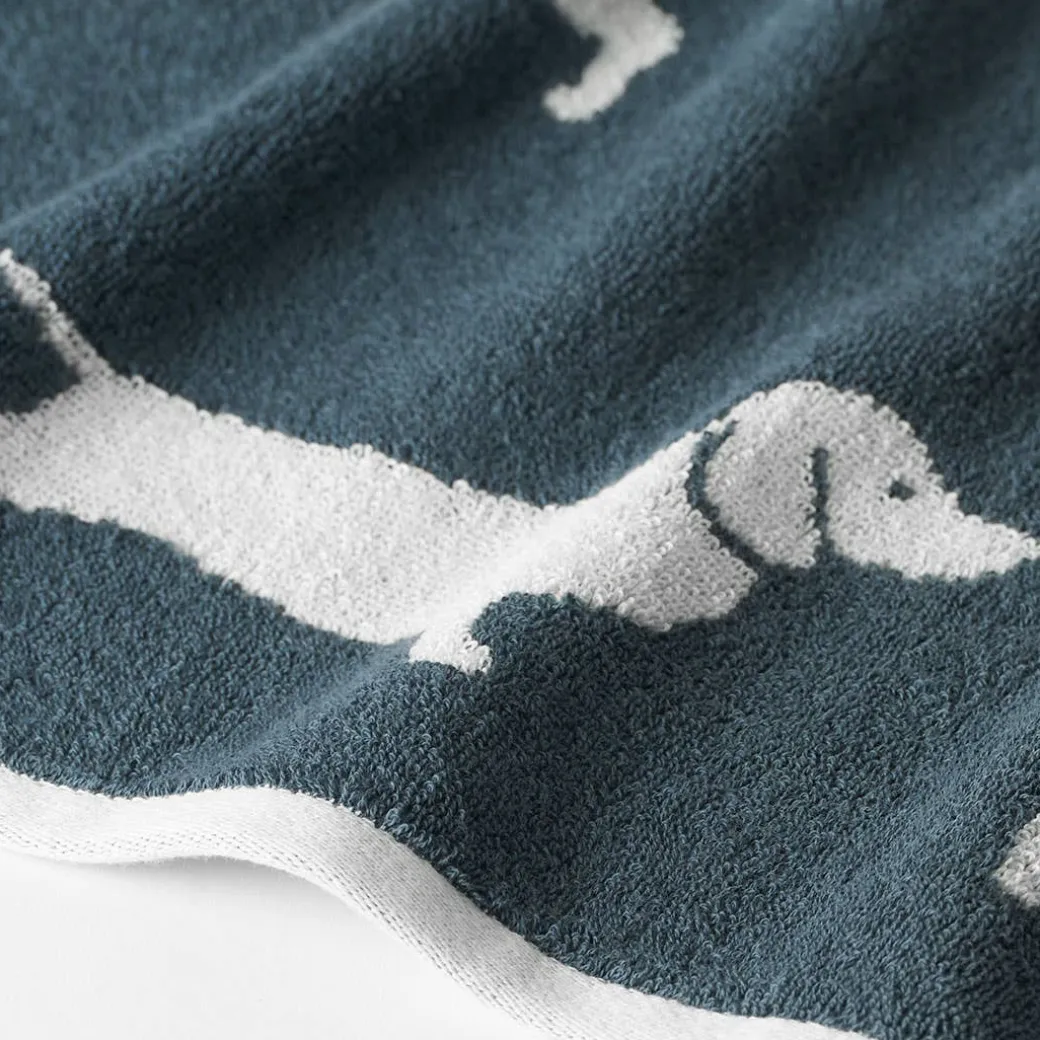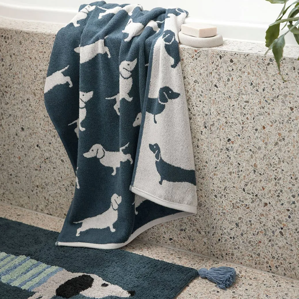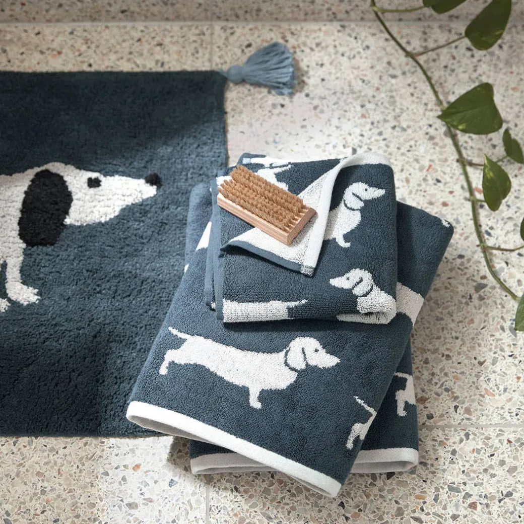 The Frankie Dog bath towels will bring a playful style to your bathroom. Made using the finest grade cotton and featuring a novelty dachshund motif, this towel has been woven using a double yarn construction which gives fullness and an even texture to the pile. Absorbent and soft, this towel will maintain its shape and texture after washing and tumble drying.