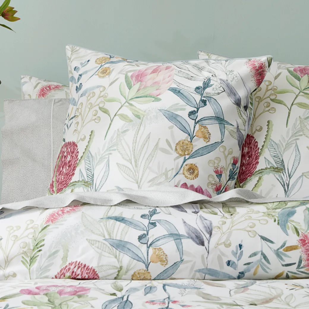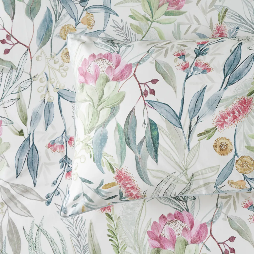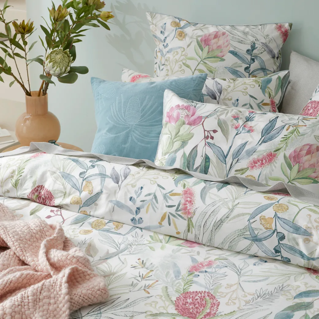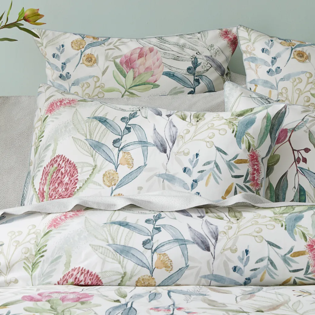 Welcome nature indoors with the Moss Vale quilt cover. Hand-painted in our Melbourne studio, this design features native Australian botanicals printed on smooth cotton sateen. Finished with a flat piping trim and printed reverse.