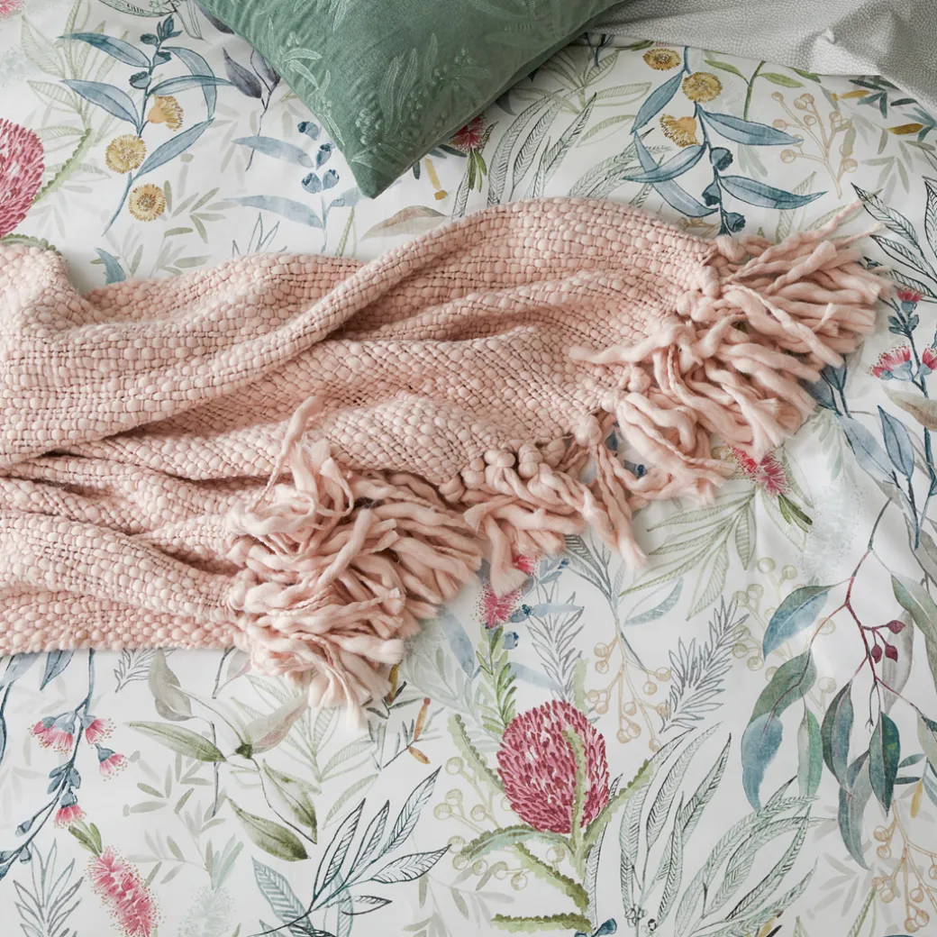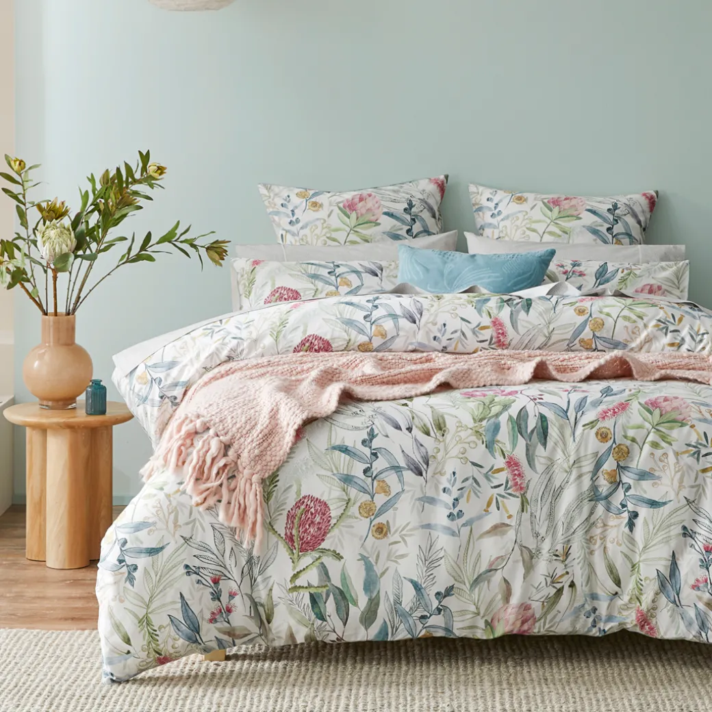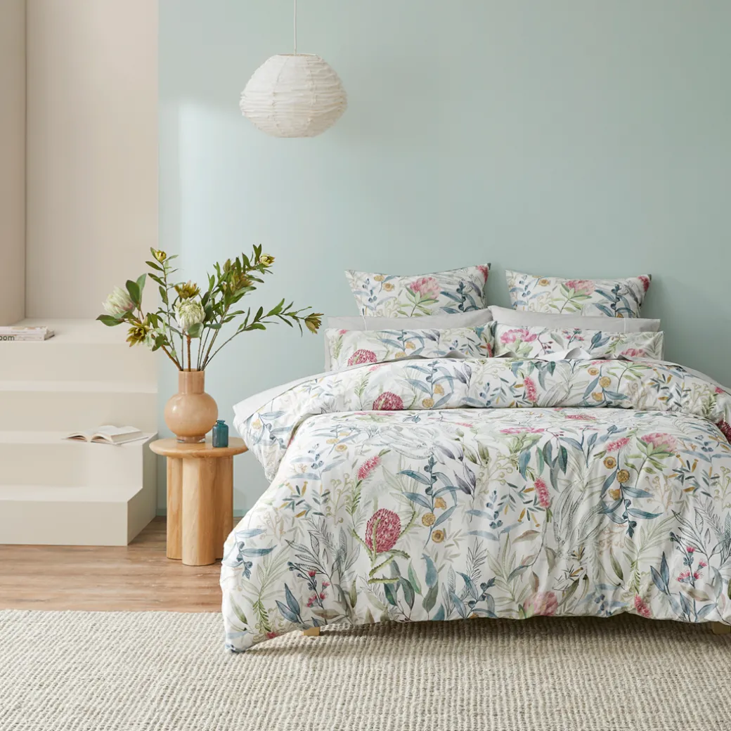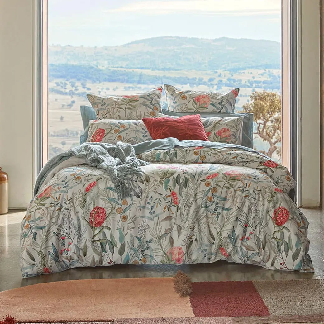 Welcome nature indoors with the Moss Vale quilt cover. Hand-painted in our Melbourne studio, this design features native Australian botanicals printed on smooth cotton sateen. Finished with a flat piping trim and printed reverse.