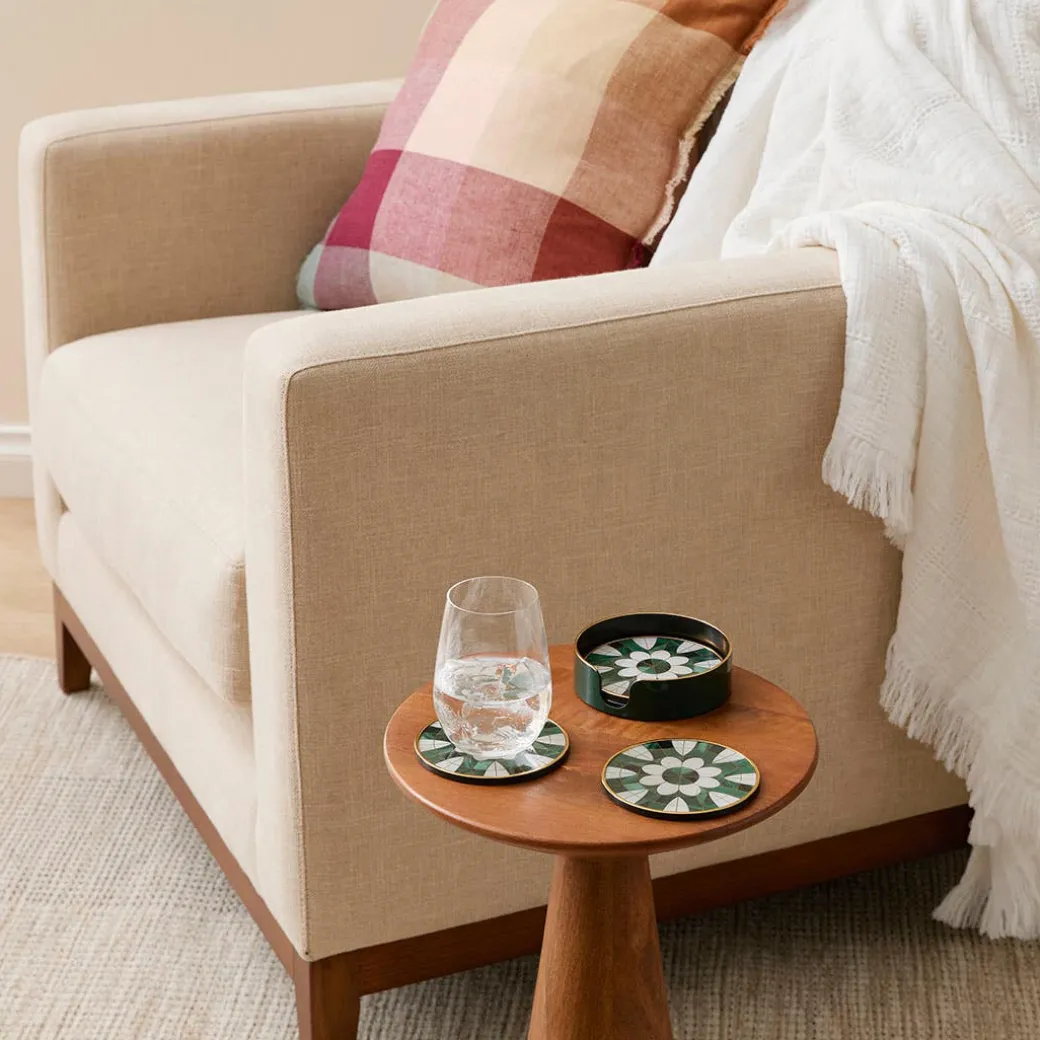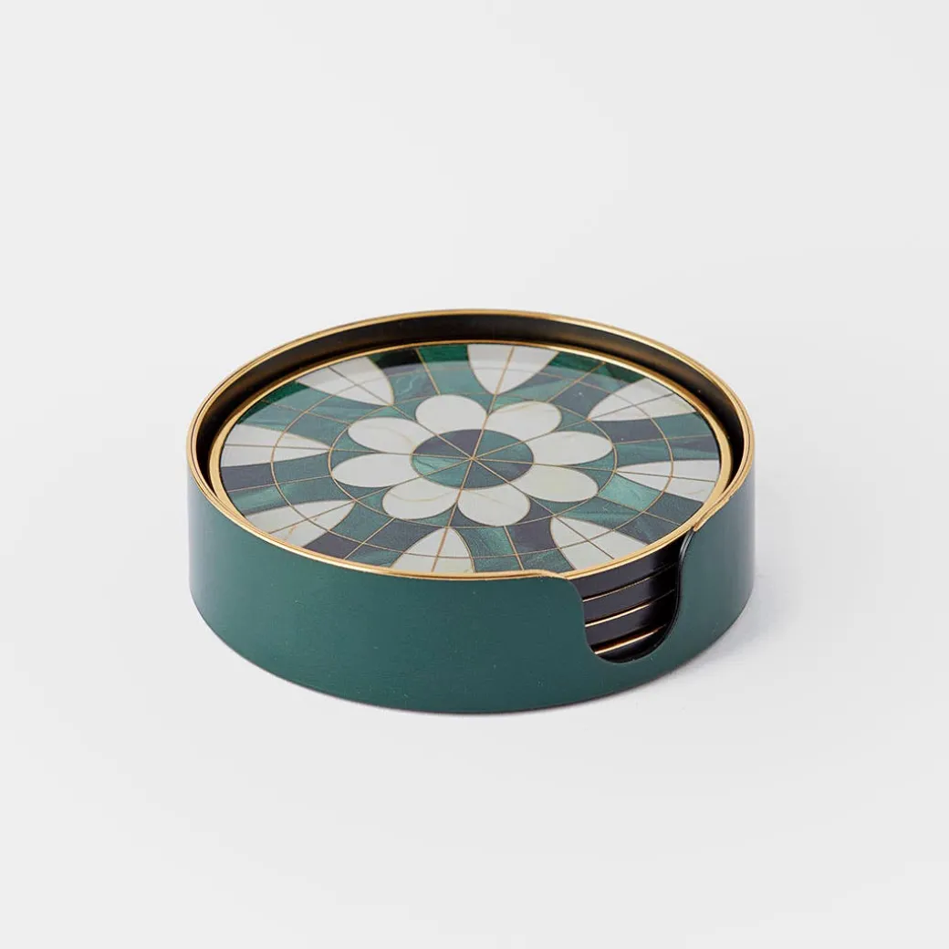 Practical and stylish, the Nadia Coaster Set offers sophisticated style. Featuring a patterned surface with green, white and gold details, this set of 4 coasters is perfect for gifting or elevating your table setting.