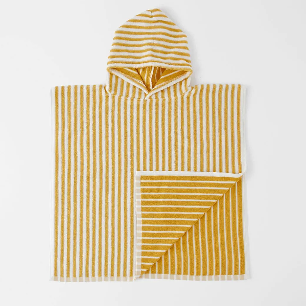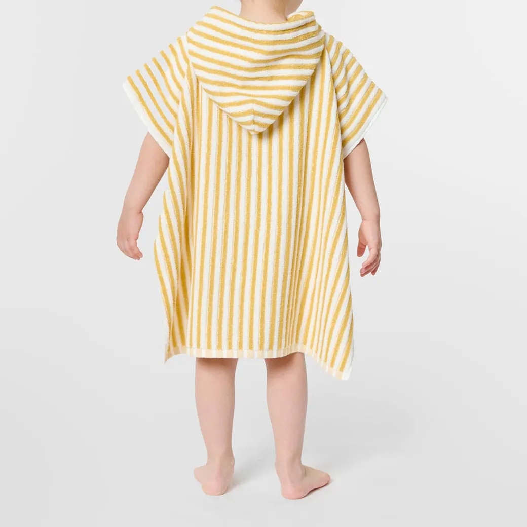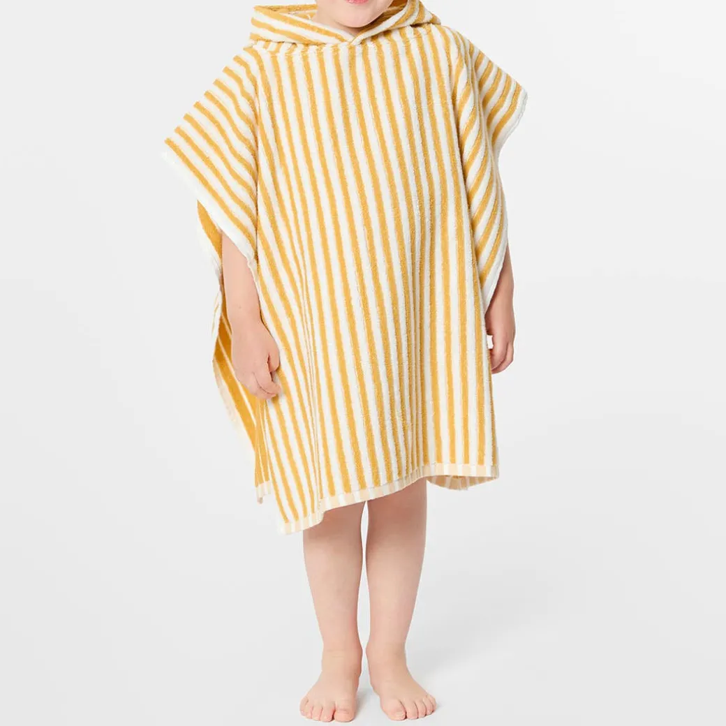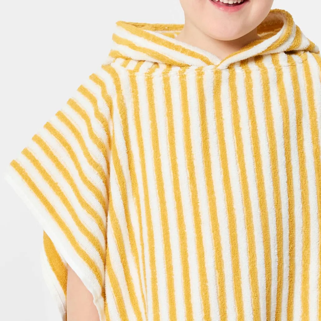 Keep your little one cosy and dry in the Yellow Striped Hooded Kids Poncho. Made from 100% cotton with a soft velour finish, this hooded towel is great for the beach, pool, or bath time.