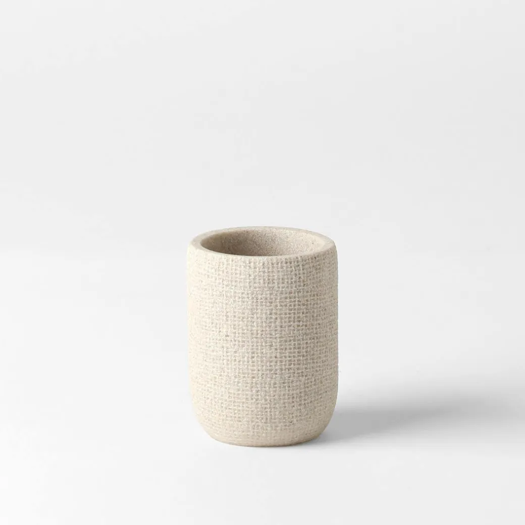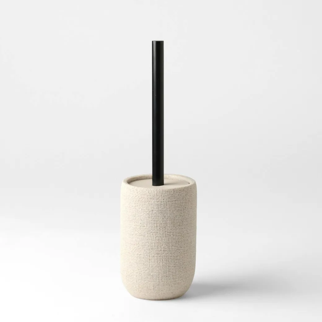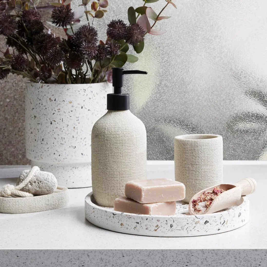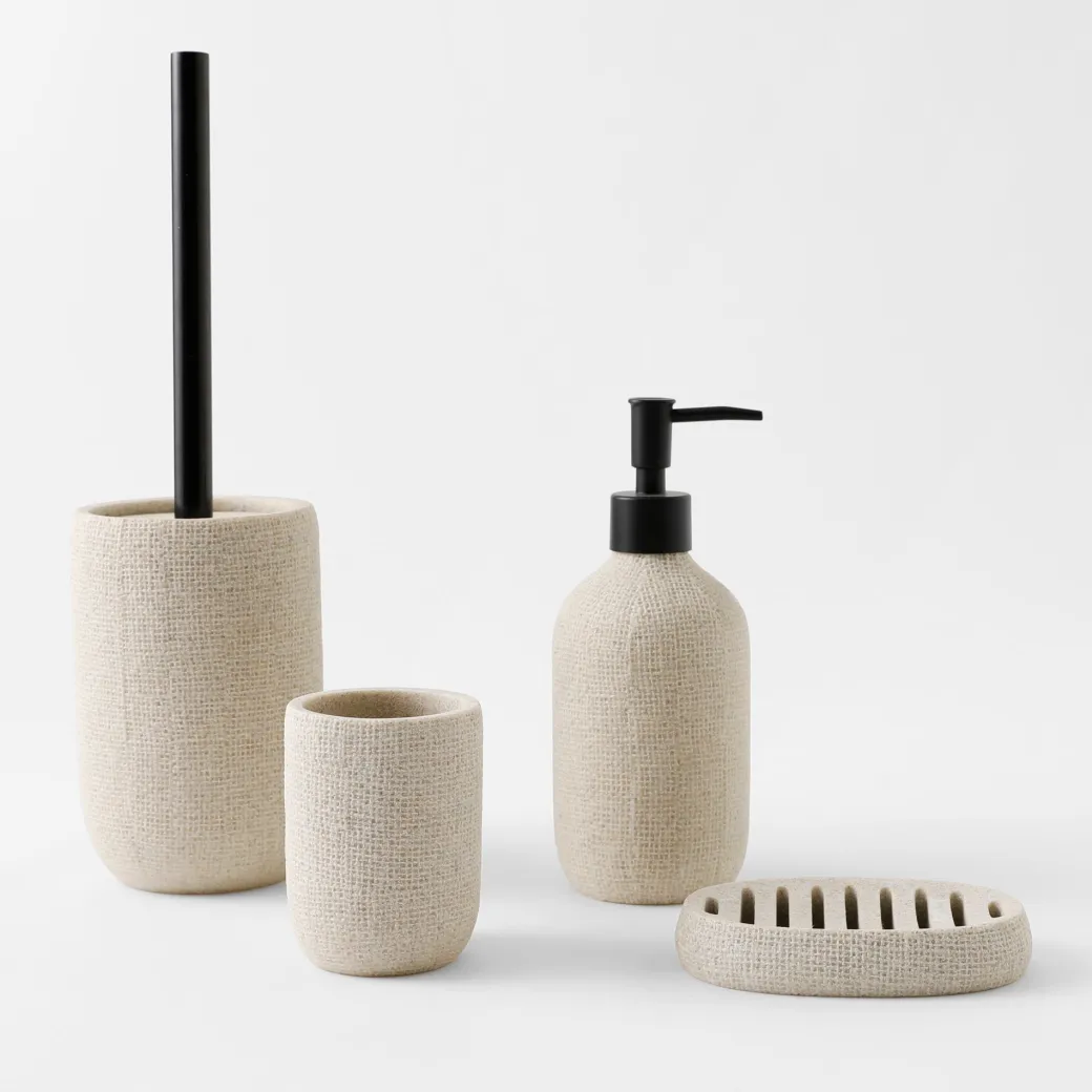 Create a natural style in your bathroom with the Weave Bathroom Accessories. This range features a textured, weave-like pattern in sand tones with black finishes.