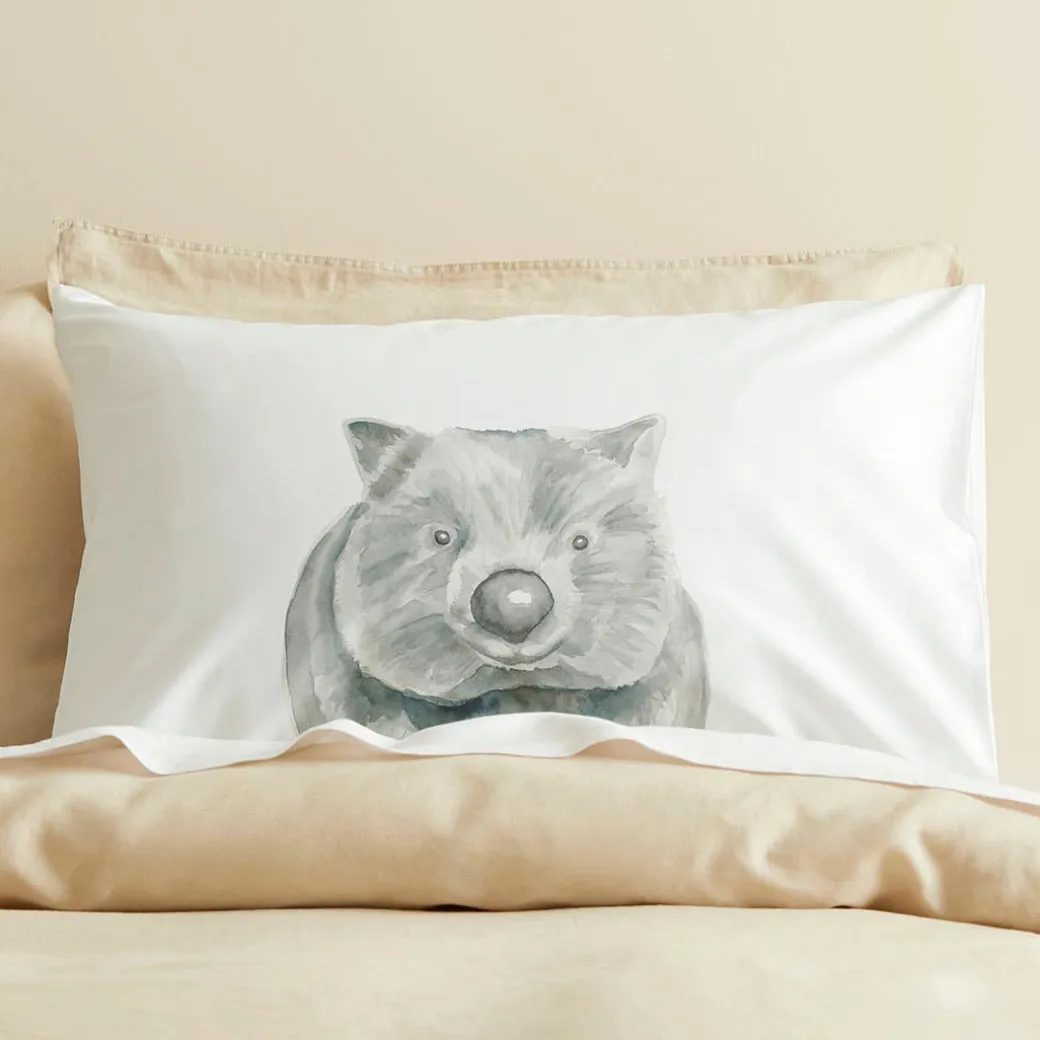 Add personality and a uniquely Australian touch with the Wombat Face Pillowcase. Featuring a wombat painted in soft grey watercolours, this 250 thread count pillowcase is perfect for gifting or styling a kids bed.